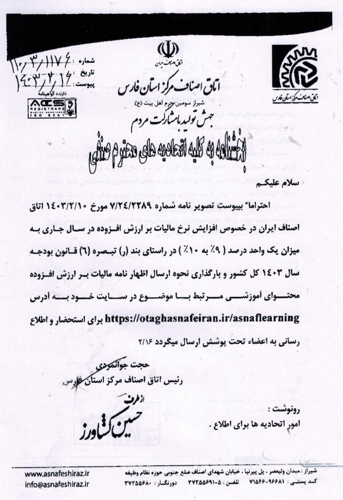 بخشنامه اتاق اصناف در خصوص بارگذاری محتوای آموزشی به ویژه در مورد افزایش نرخ مالیات بر ارزش افزوده بر روی سامانه اتاق اصناف ایران