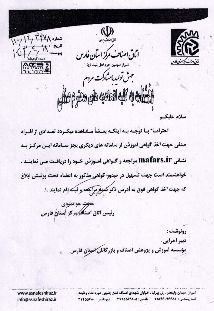 بخشنامه اتاق اصناف در خصوص تاکید مجدد بر نشانی سامانه آموزش و پژوهش اصناف و عدم استفاده از سایر وب سایت ها