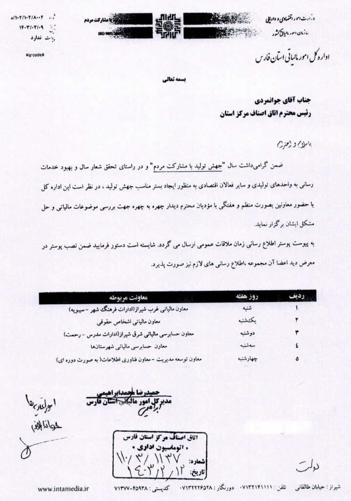بخشنامه اتاق اصناف در خصوص جدول برنامه هفتگی ملاقات عمومی معاونین اداره کل امور مالیاتی استان فارس با مودیان
