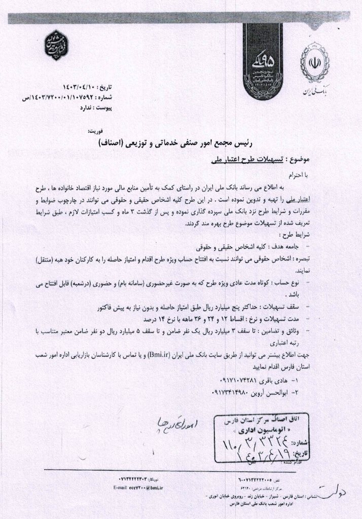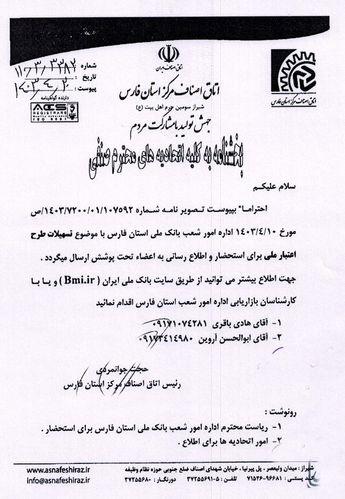 بخشنامه اتاق اصناف در خصوص معرفی طرح اعتبار ملی مربوط به بانک ملی ایران