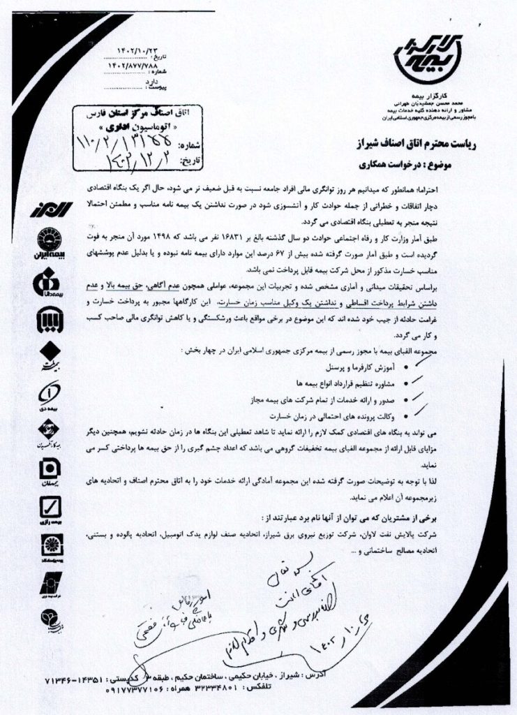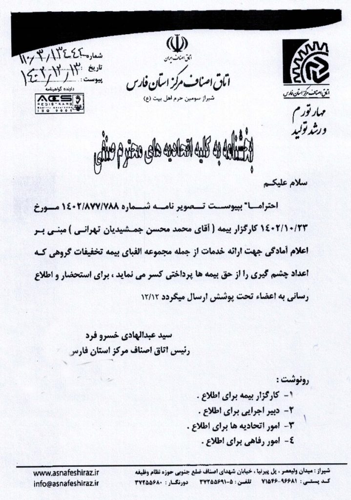بخشنامه اتاق اصناف در خصوص معرفی مجموعه الفبای بیمه با کارگزاری آقای محمد محسن جمشیدیان تهرانی جهت بهره گیری اصناف از خدمات بیمه ای