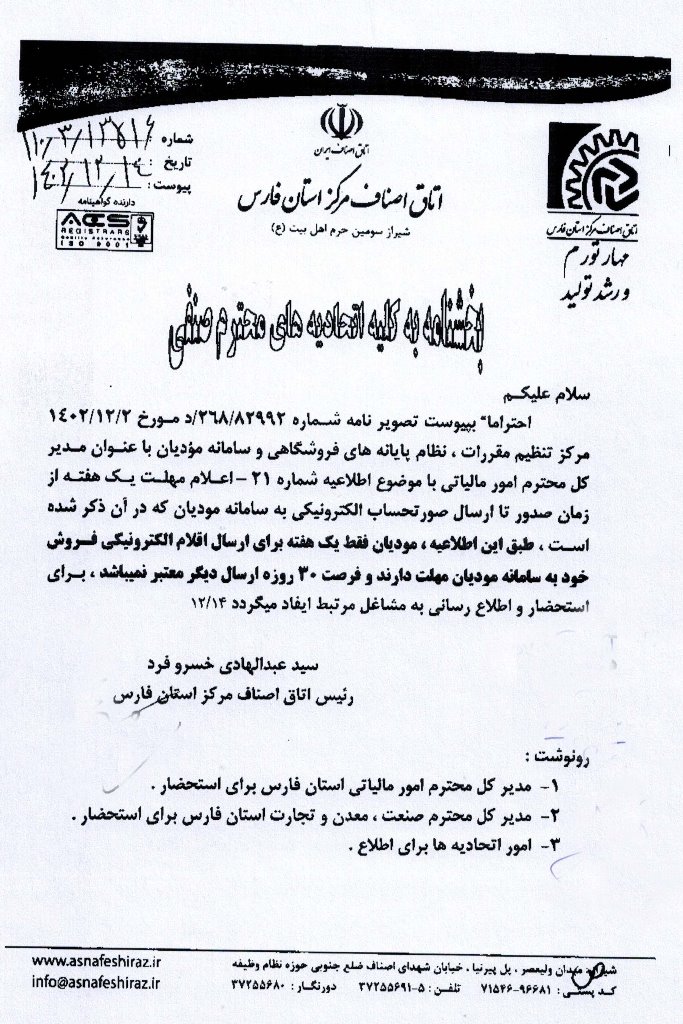 بخشنامه اتاق اصناف در خصوص کاهش زمان (صدور تا ارسال صورتحسابهای الکترونیک به سامانه مودیان امور مالیاتی) به یک هفته