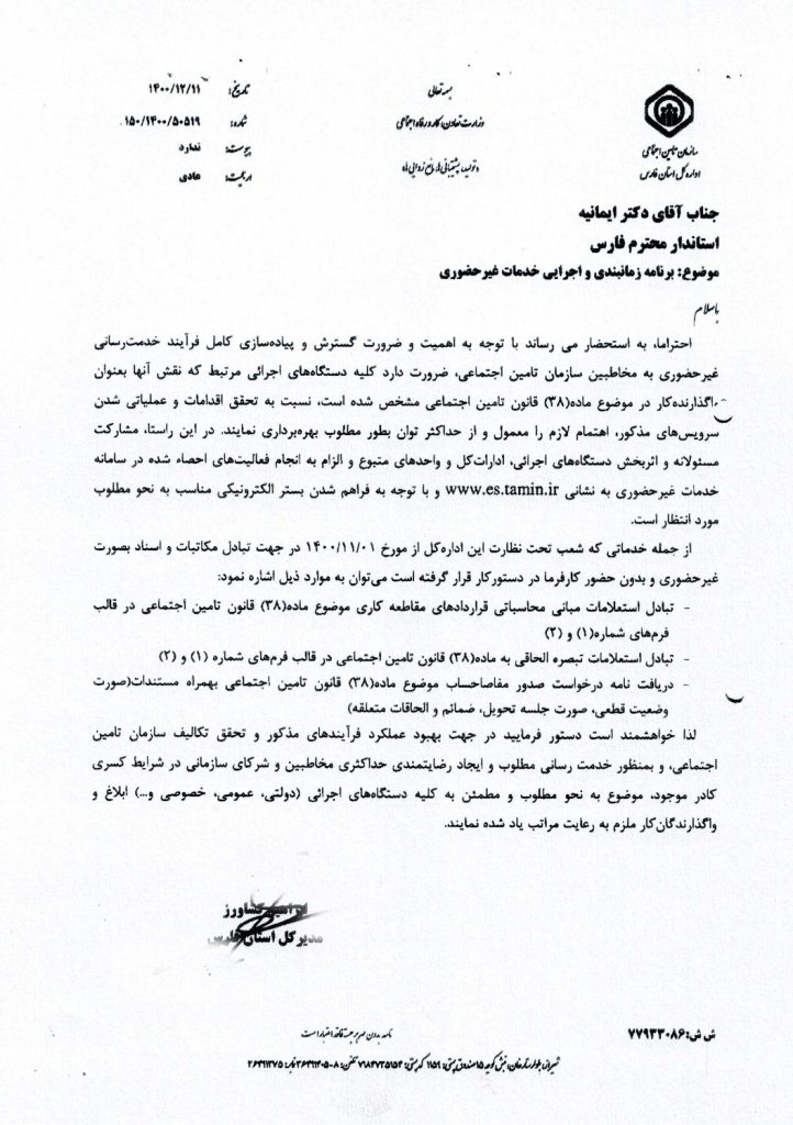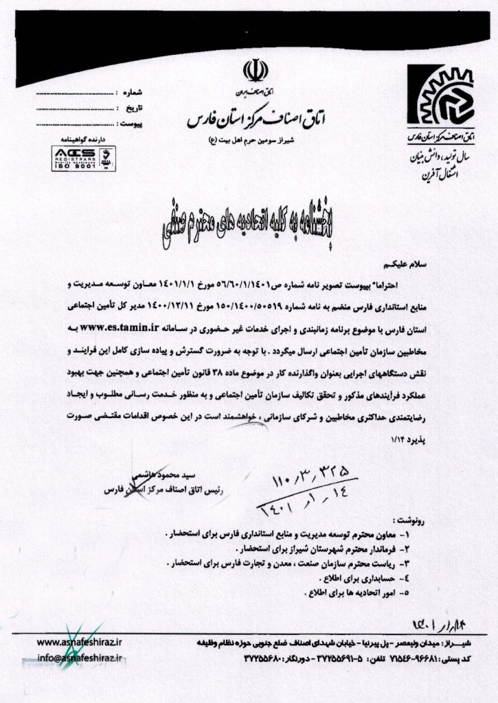 بخشنامه اتاق اصناف مبنی بر اجرای خدمات غیر حضوری سامانه سازمان تأمین اجتماعی
