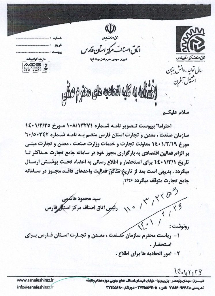 بخشنامه اتاق اصناف مبنی بر الزام کلیه فعالان اقتصادی به بارگذاری مجوز خود در سامانه جامع تجارت حداکثر تا یکم خرداد ماه ۱۴۰۱