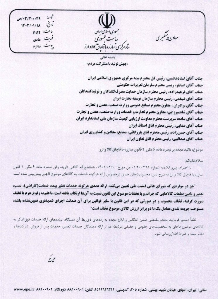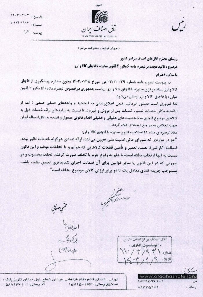 بخشنامه اتاق اصناف مبنی بر عدم نگهداری ،فروش و ارائه خدمات در خصوص کالاهای موضوع قانون مبارزه با قاچاق کالا و ارز