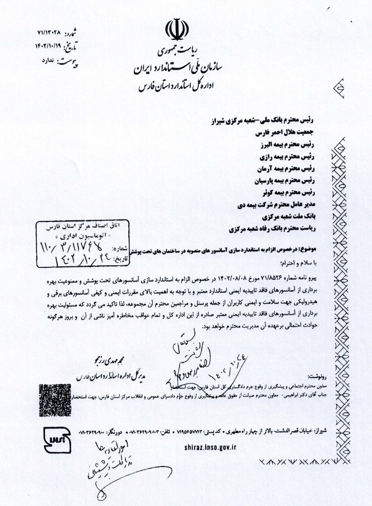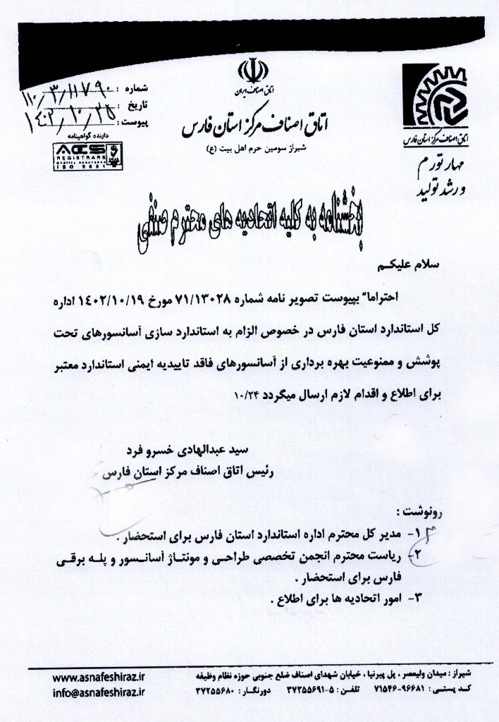 بخشنامه مجدد اتاق اصناف در خصوص عدم استفاده از آسانسورهای فاقد تاییدیه ایمنی استاندارد معتبر