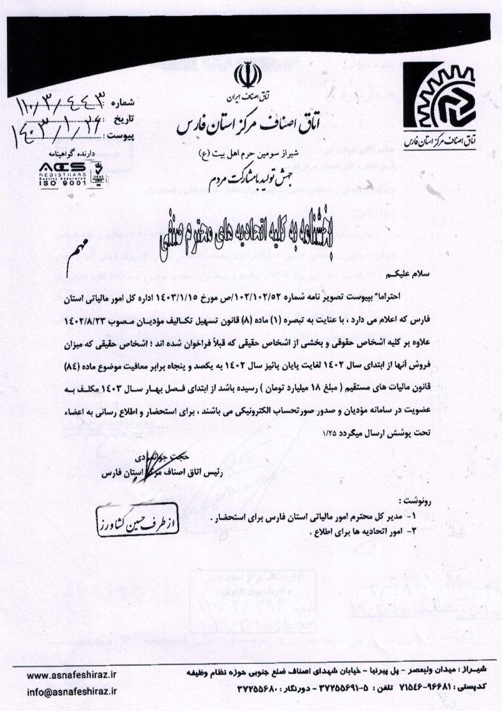 بخشنامه مجدد اتاق اصناف مبنی بر اطلاع رسانی به افراد صنفی حقیقی در خصوص الزام صدور صورتحساب الکترونیک در سامانه مودیان در صورتی که میزان فروش آنها از ابتدای سال لغایت پایان پائیز ۱۴۰۲ به ۱۸ میلیار تومان رسیده باشد.